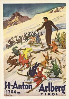 charming poster by Berta Czegka, which shows the legendary ski instructor Hannes Schneider trying to teach a beginner’s class that consists of M&M–colored bunnies on skis. They’re snow bunnies on the bunny hill.” In that time and place, “snow bunny” (kaninchen) referred to any new skier, male or female, while schneehase (snow hare) implied a canny veteran.